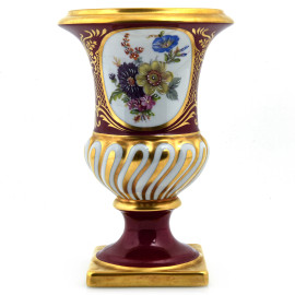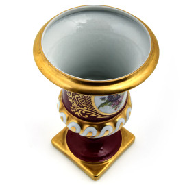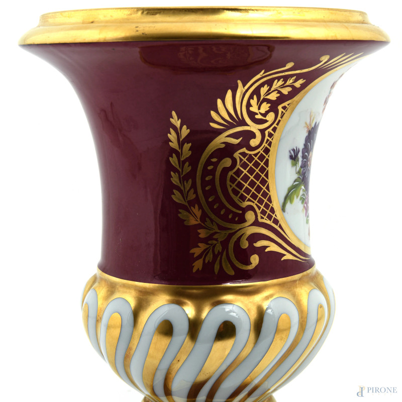 Vaso in porcellana Limoges nei toni del magenta, del bianco e dell'oro con decori floreali, altezza cm 23,5, (lievi segni di usura)