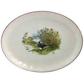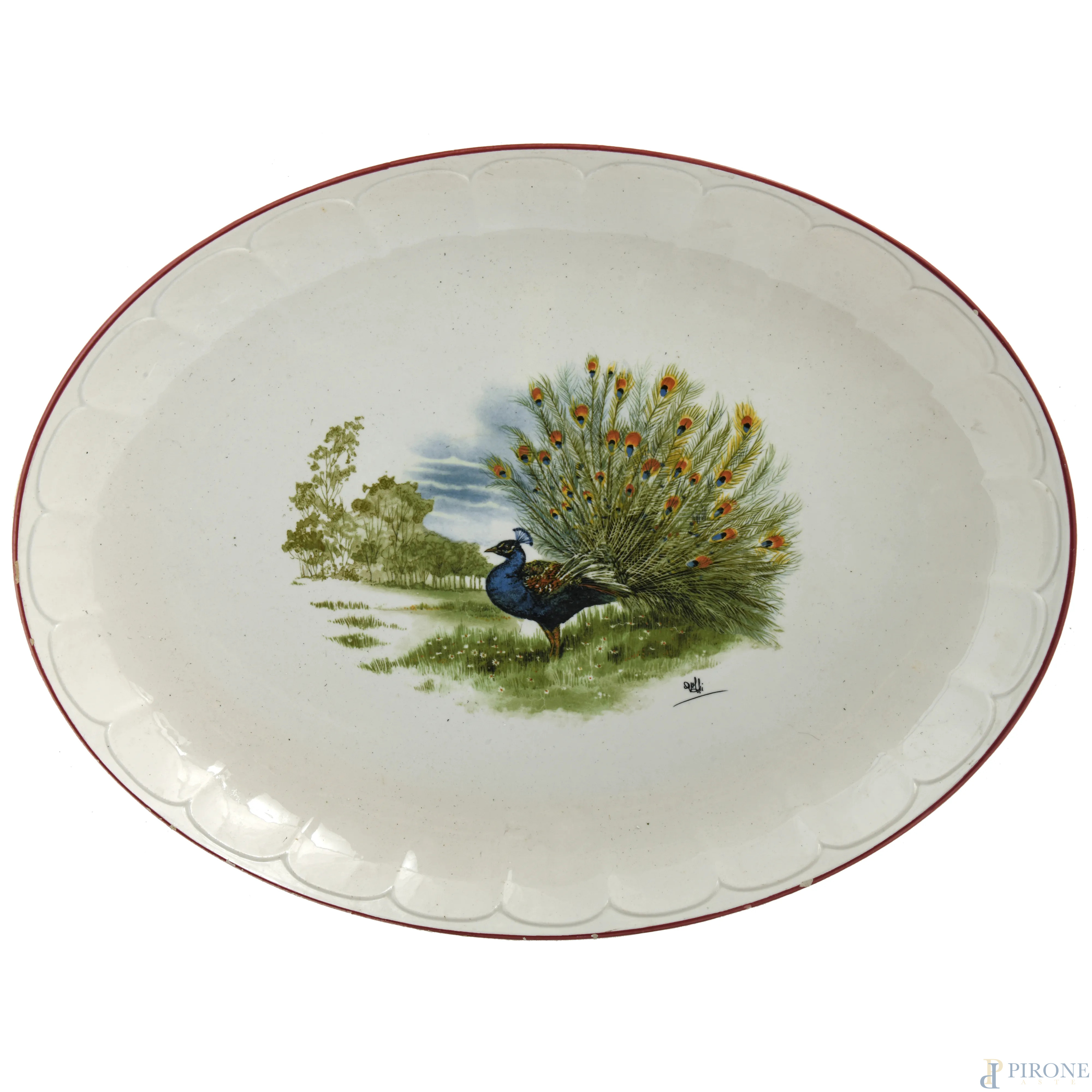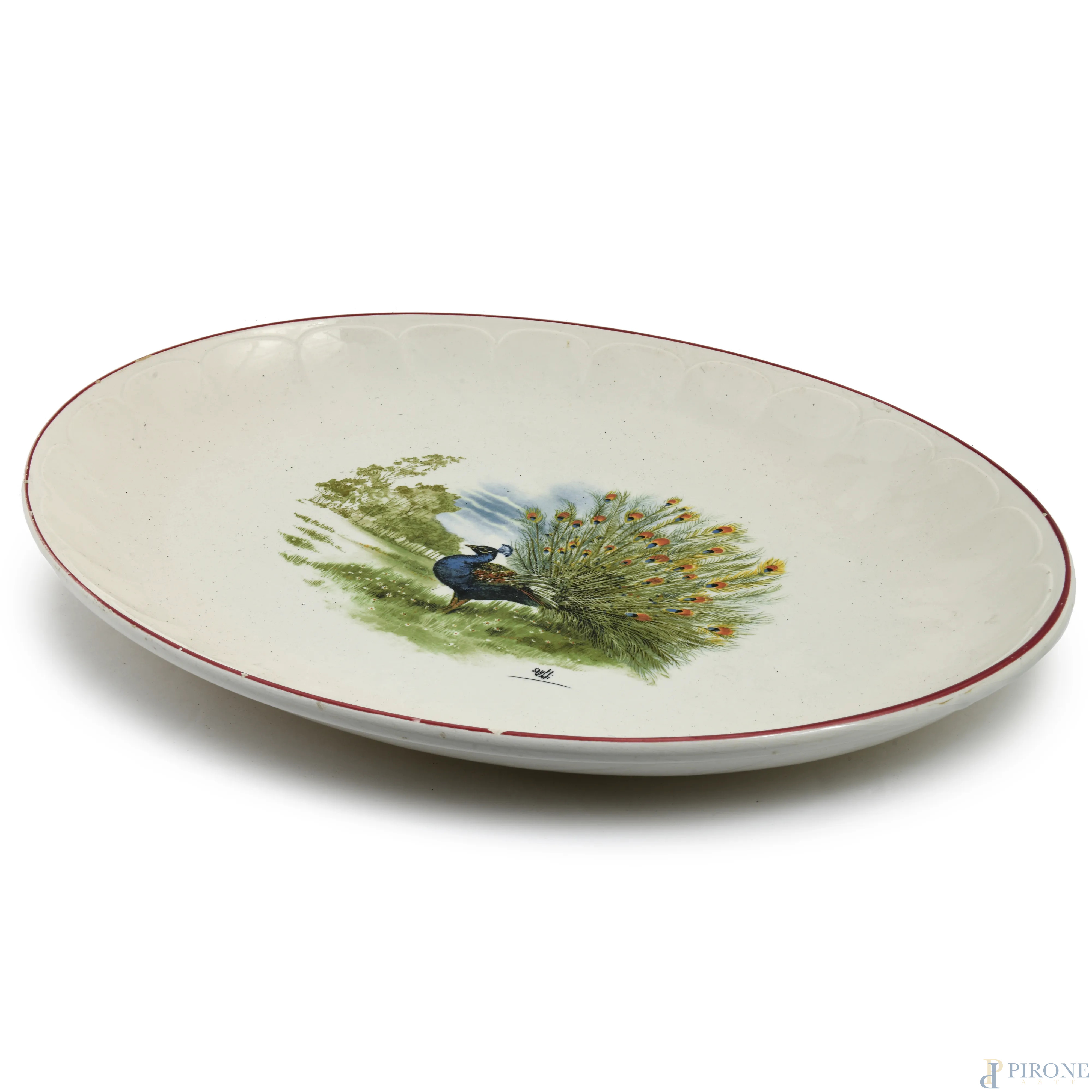 Vassoio in maiolica a fondo bianco con decoro a pavone al cavetto, XX secolo, cm 6x55,5x42,5, (segni di usura, scalfiture, difetti)