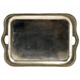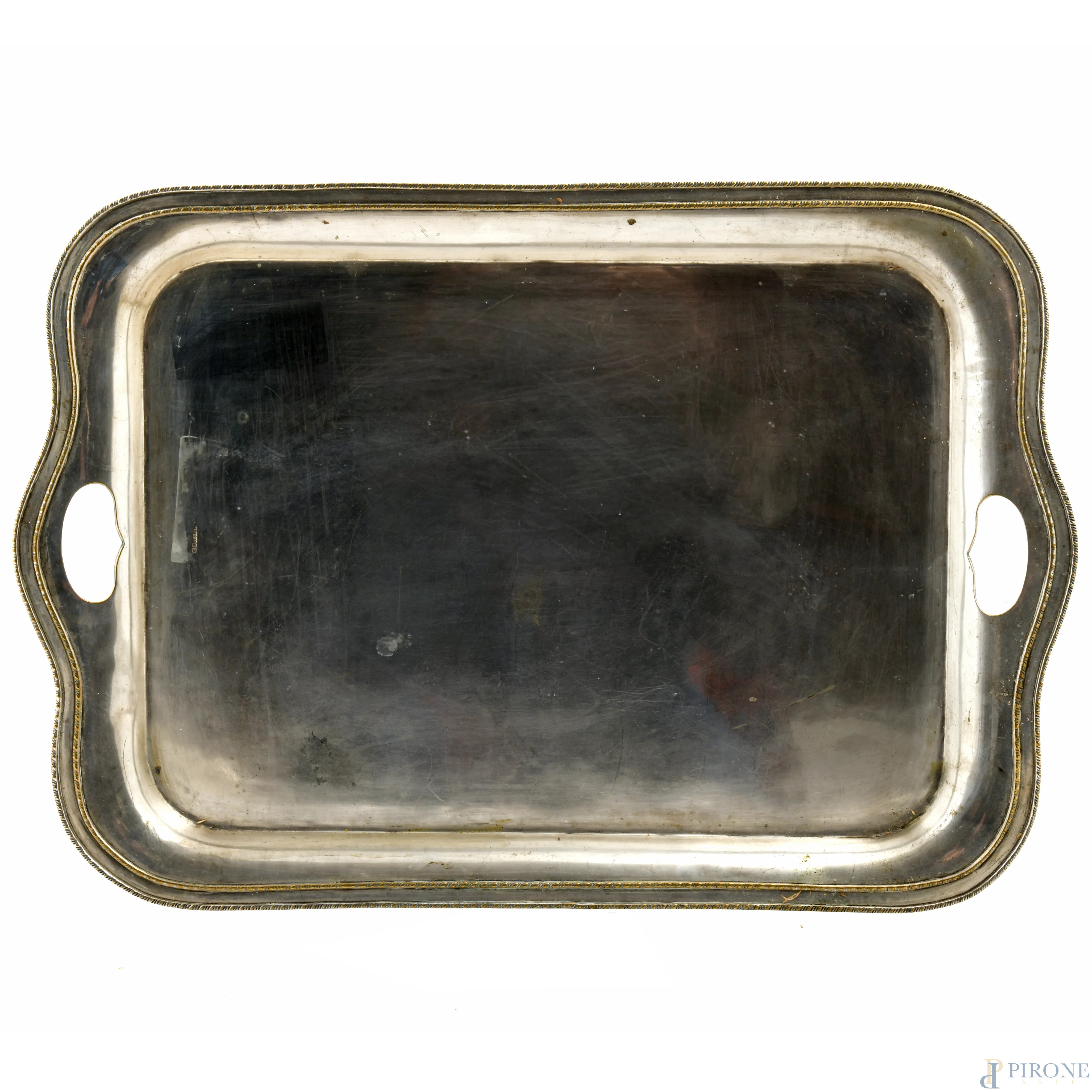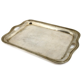 Vassoio in metallo argentato a doppia presa, XX secolo, cm 60,5x41,5, (segni di usura)
