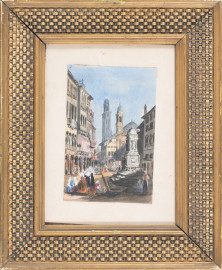 Veduta di Piazza Sant'Antonio a Padova, XIX-XX secolo, tecnica mista su carta, cm 16,5x10,5, entro cornice