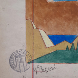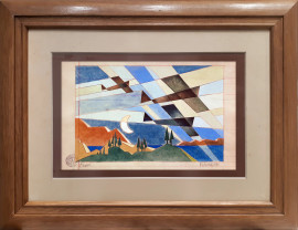 Vittorio Caproni, (XX secolo), Aeropittura, tecnica mista su carta, cm 22x35, titolato “FUTURAEREI’ in basso a sinistra, firma e timbro dell’artista, con cornice