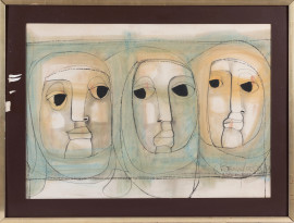 Volti, XX secolo, tecnica mista su carta, cm 62x87, firmato in basso a destra, entro cornice, (ondulazioni della carta, lievi segni di usura)